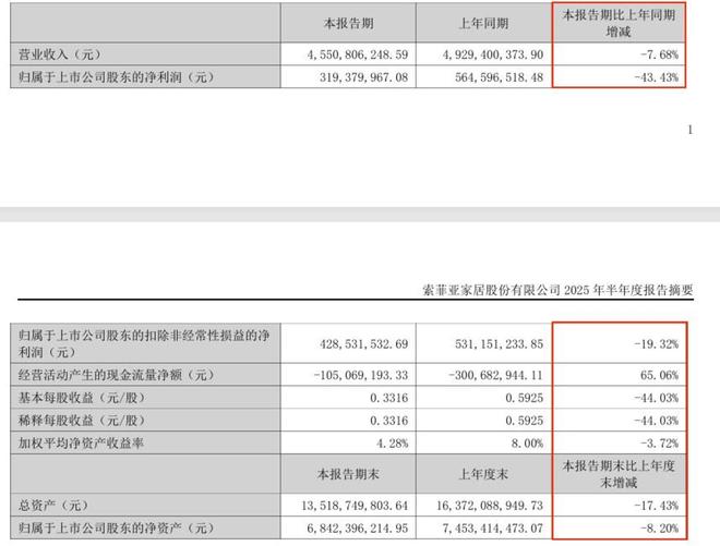 值得关注的是,索菲亚核心业务毛利率从2024年上半年的35.76%降至2025年上半年的34.38%,净利率更是从12.05%下滑至7.32%。