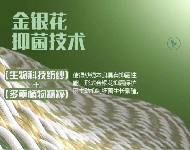 金银花保护层,将精油成分锁在面料里面,让面料更柔软细腻芬芳愉悦,同时具有很好的滋润保湿效果。